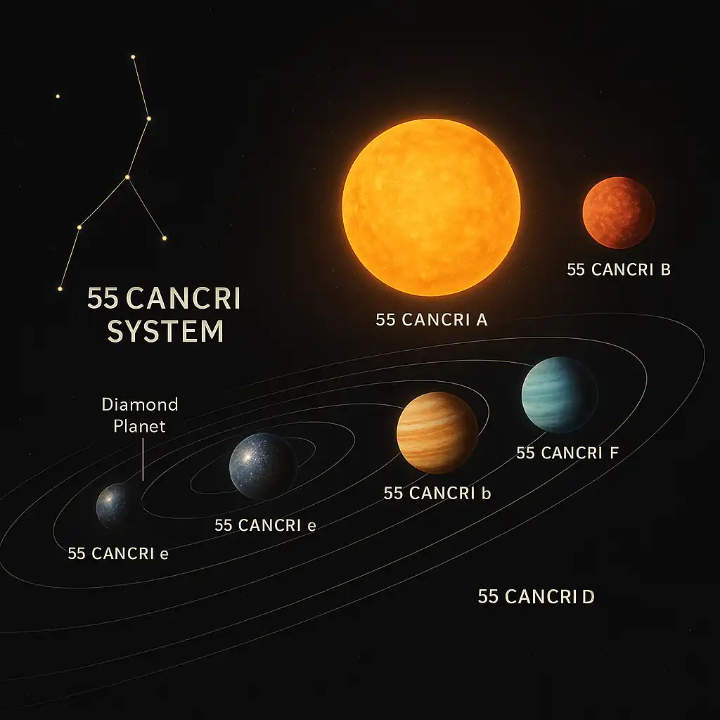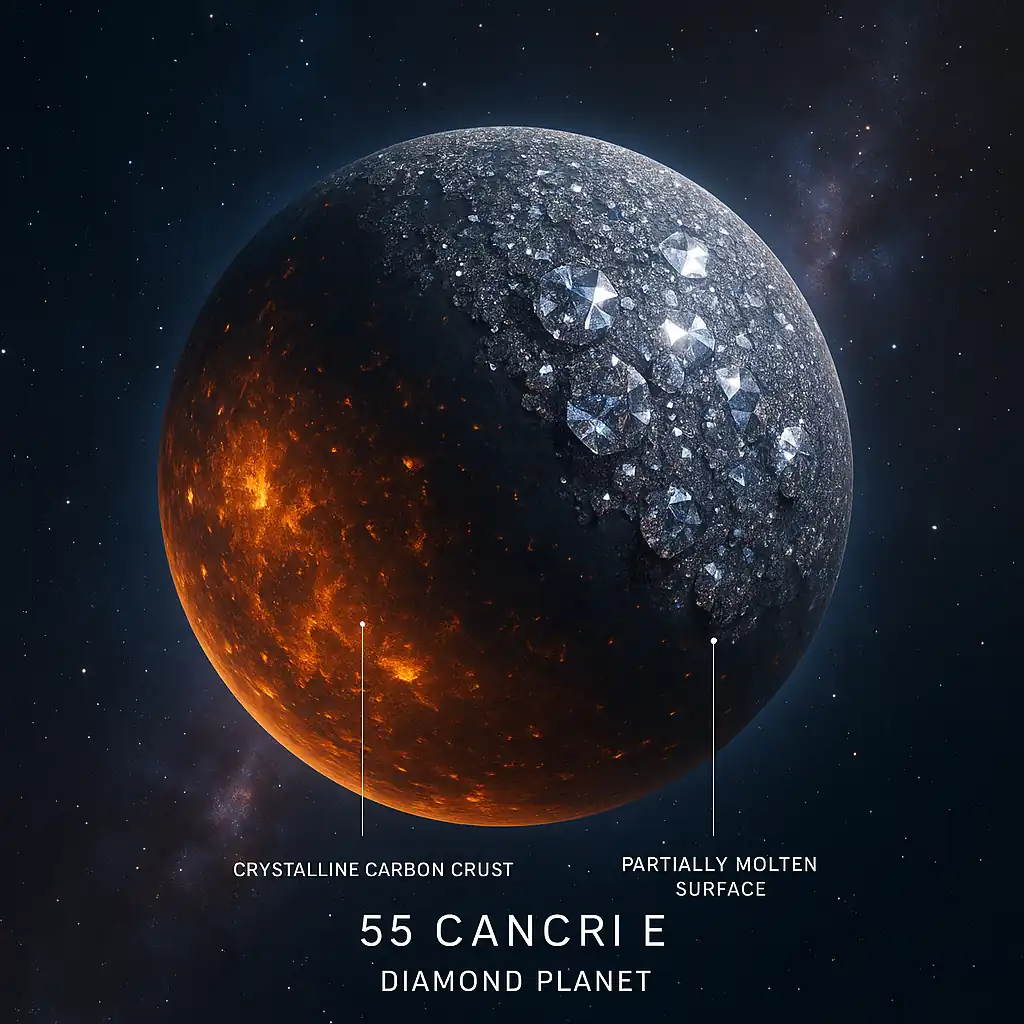 The 55 Cancri e diamond planet earned its nickname from early theories about its carbon-rich composition. In 2012, Yale researchers, led by Nikku Madhusudhan, proposed that up to a third of its mass—equivalent to three Earth masses—could be carbon, much of it as diamond and graphite. The planet’s host star, 55 Cancri A, shows a high carbon-to-oxygen ratio, suggesting the planetary system formed from carbon-rich material. High pressures and temperatures inside the planet could transform this carbon into diamond, creating a unique rocky world.