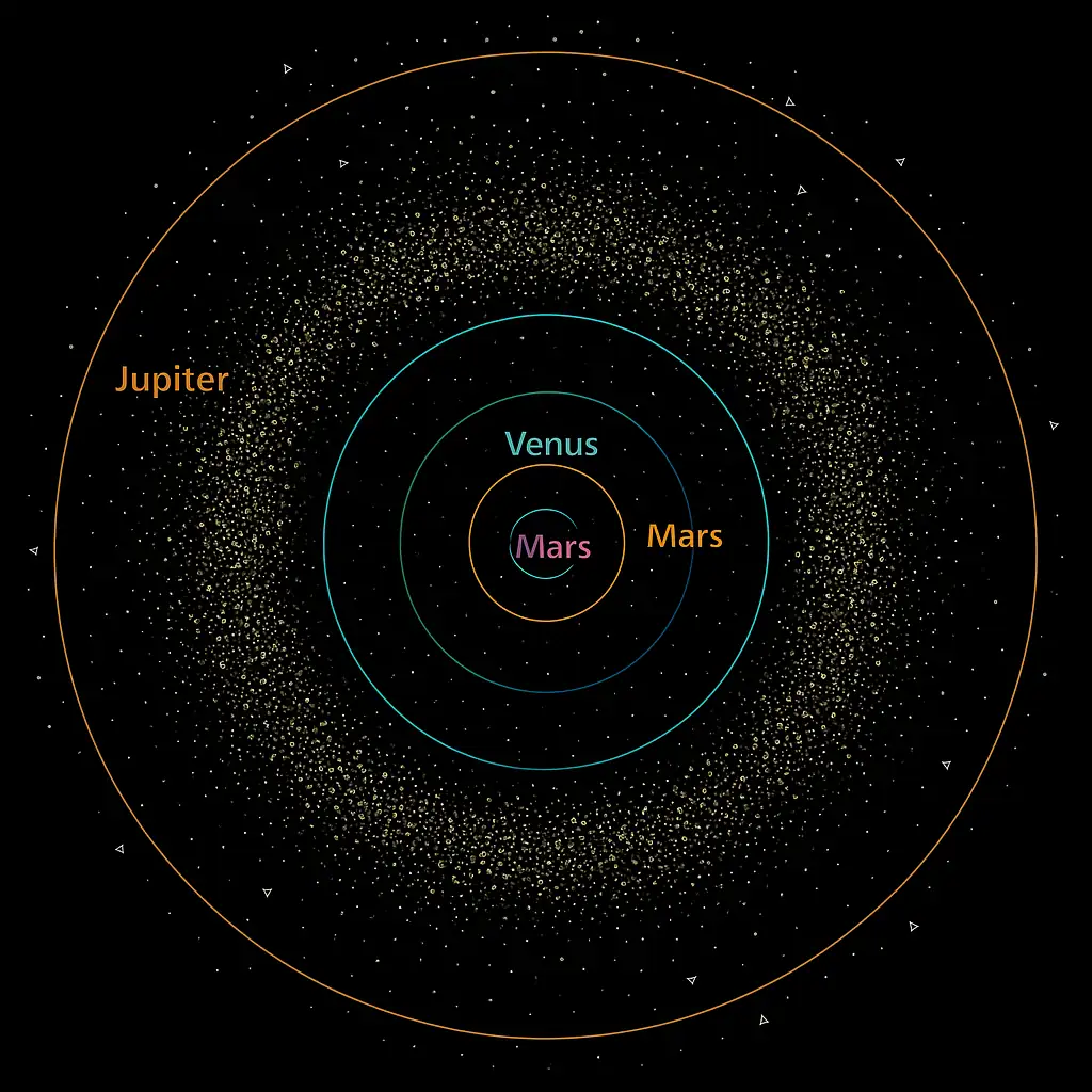 The Asteroid Belt spans a wide area between Mars and Jupiter. Its inner edge is about 2.2 astronomical units (AU) from the sun. The outer edge reaches around 3.2 AU. One AU is the distance from Earth to the sun. For context, Mars orbits at 1.5 AU, and Jupiter at 5.2 AU. The belt contains countless asteroids. However, their total mass is small. It’s less than 4% of Earth’s moon. Ceres, the largest object, has a diameter of 590 miles (940 km). Meanwhile, most asteroids are much smaller. Many are just a few miles across. Others are mere dust particles. The belt isn’t a dense swarm like in movies. Instead, asteroids are spread far apart. For example, spacecraft can pass through without much risk. The asteroids vary in composition. Some are rocky, made of silicate. Others are metallic, rich in iron and nickel. Additionally, some contain carbon or even water ice. Therefore, the belt is a mix of different materials. These traits reflect the solar system’s early conditions. Scientists study them to learn about planetary formation.