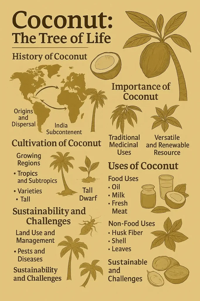 The coconut palm, scientifically known as Cocos nucifera, belongs to the Arecaceae family. Thriving in tropical coastal regions, the coconut palm stands as a single species in its genus. Often called the “tree of life,” it offers a wide range of uses. Its fruit provides food, water, and oil. Meanwhile, leaves and husks serve as building materials. Additionally, its cultural role spans centuries. Ancient communities depended on it for survival. Today, it remains a dietary staple globally. Industries value its versatility. Moreover, health benefits draw worldwide attention. On the other hand, some risks need consideration. Environmental impacts also warrant focus. As of 2025, research highlights its significance. Therefore, let’s explore its journey. This article covers its past and present.