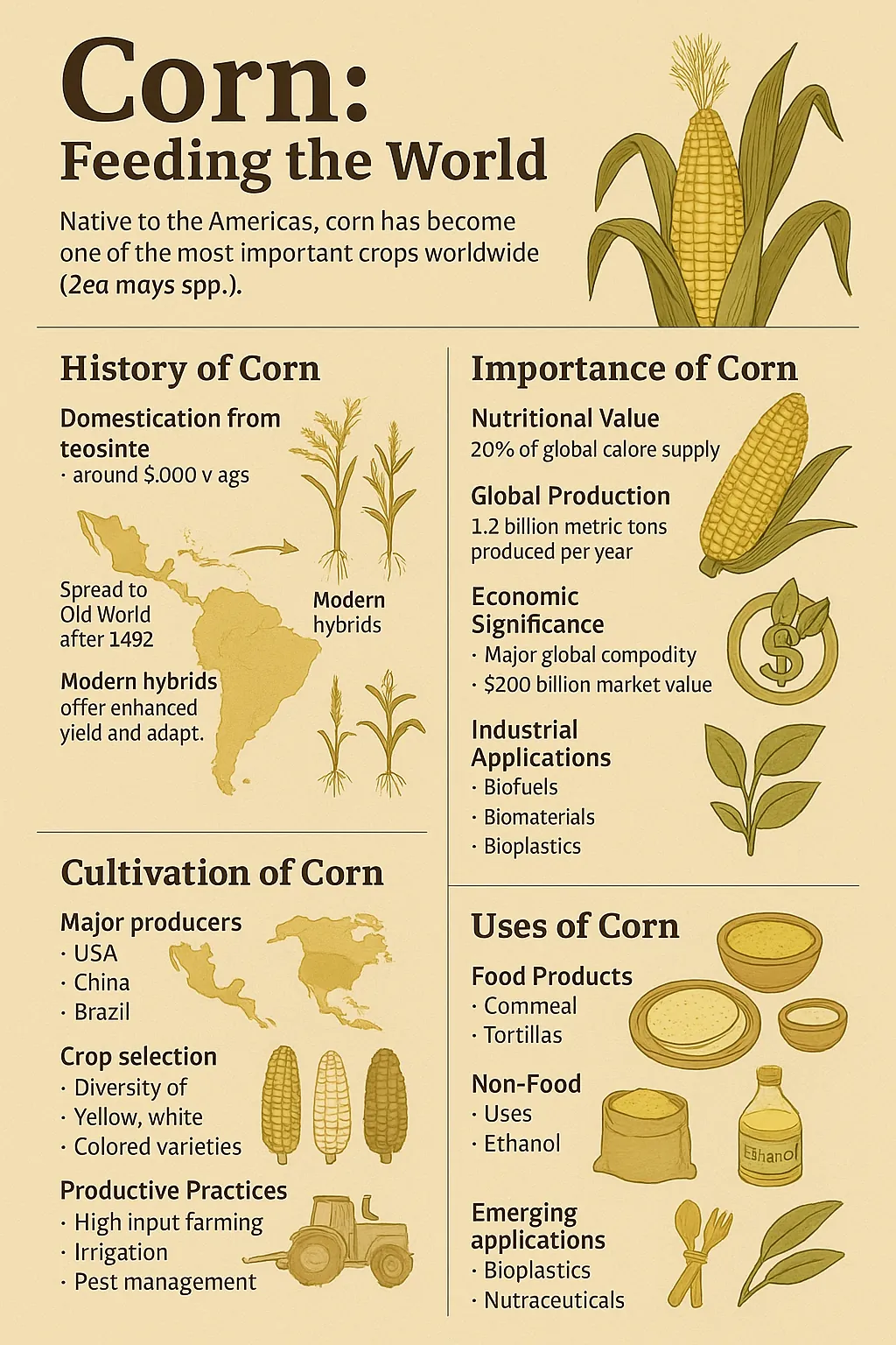 Can one plant change the world? Corn, or Zea mays, proves it can. This cereal crop, often called maize, powers diets, industries, and cultures worldwide. Picture a tall grass with rows of golden kernels on a cob. Those kernels have fed humanity for thousands of years. Born in southern Mexico from wild teosinte 9,000 years ago, corn became a lifeline for indigenous peoples. They shaped it into a cornerstone of their lives. After the late 15th-century Columbian Exchange, corn swept across Europe, Africa, and Asia. Now, it grows everywhere except Antarctica.