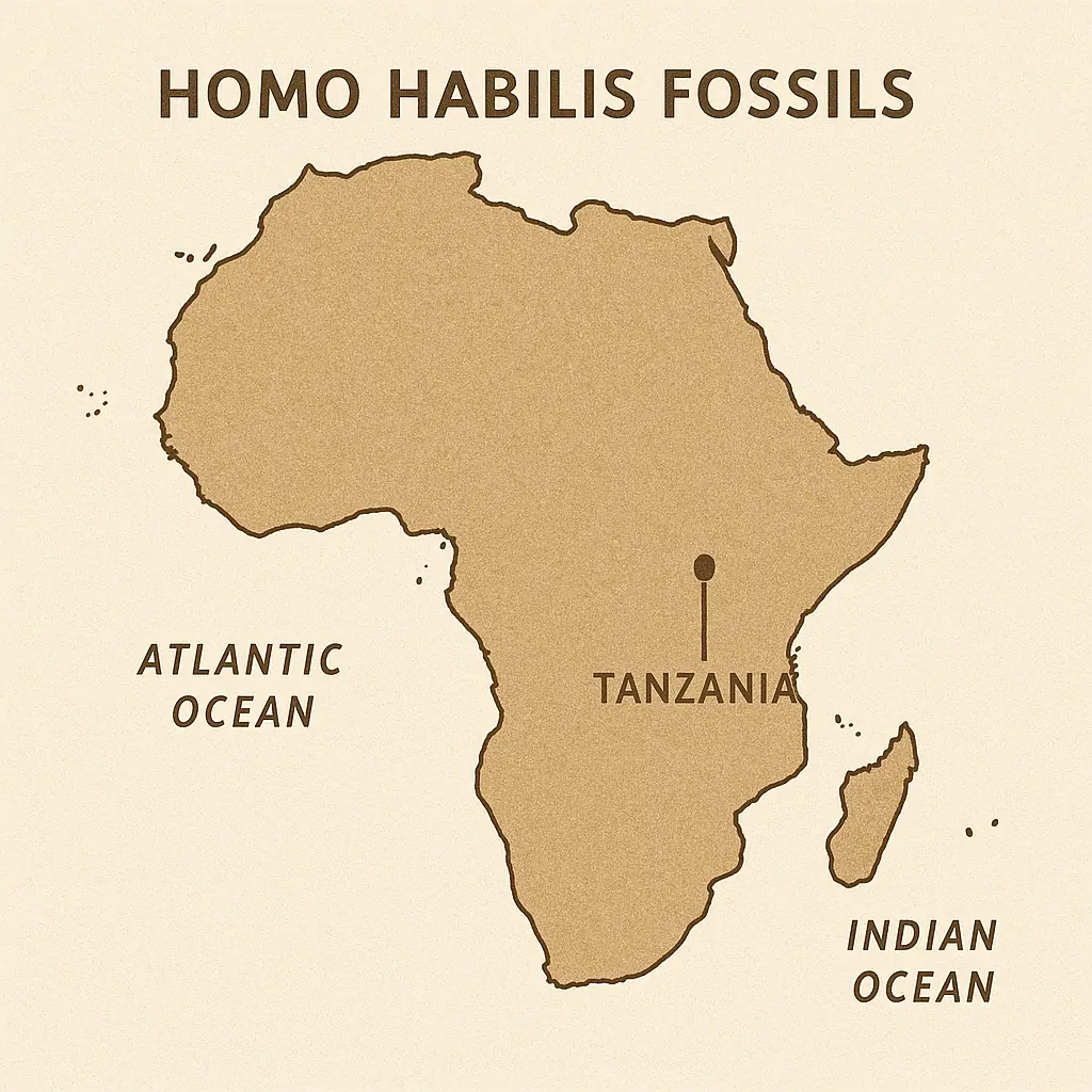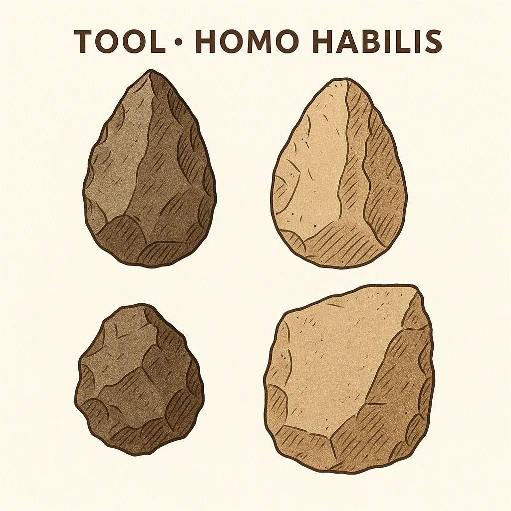 The shift to tool-making defines Homo habilis’s legacy, earning it the “handy man” name. The earliest tools, from Lomekwi 3 in Kenya (3.3 million years ago), predate Homo and are not Oldowan, likely made by Australopithecus or similar hominins. Homo habilis refined this with Oldowan tools, dated 2.9–1.5 million years ago, found in Nyayanga, Kenya. These stone flakes and cores cut meat, cracked bones for marrow, or processed plants, showing planning. The stone tool culture marked a cognitive step. Fossils like OH 7 suggest hands adapted for tool work.