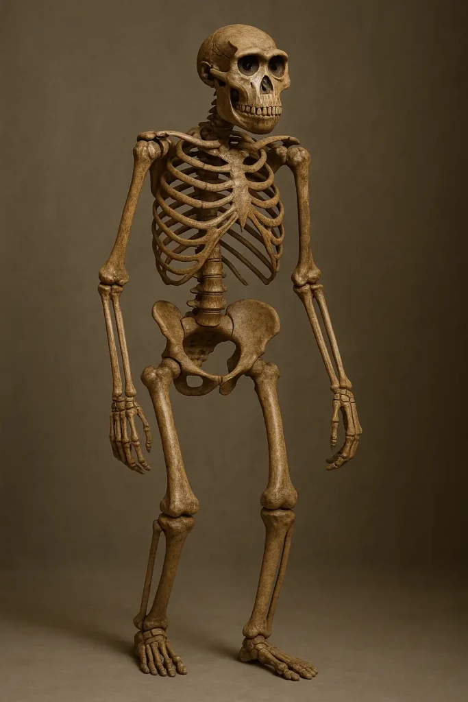This advance introduced physical differences from Australopithecus, though Homo habilis stayed small, standing 1.2–1.35 m (~4–4.4 ft) and weighing 20–37 kg. Its skull was less forward-jutting, and teeth were smaller than Australopithecus’s large grinders, reflecting an omnivorous diet. Fossils like OH 62 show long arms for some tree-climbing, but a human-like foot arch in OH 8 indicates better walking. Homo habilis was more ground-adapted than Australopithecus. It balanced ancestral and new traits.