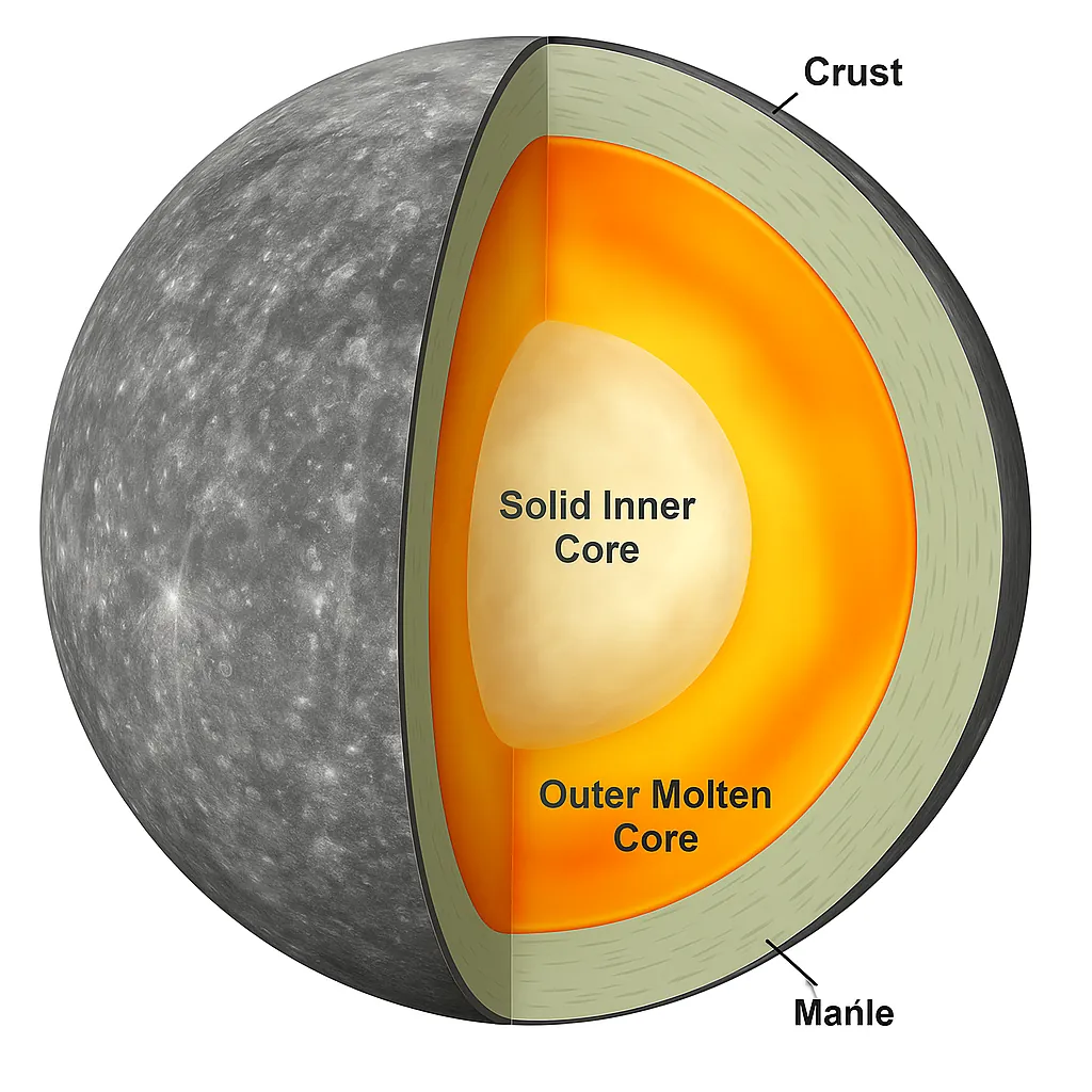 Mercury is the smallest planet in our solar system. It’s only slightly larger than Earth’s moon. Specifically, its diameter is about 3,032 miles (4,879 km). The planet is dense, second only to Earth. This density comes from its massive core. For instance, the core spans roughly 2,200 to 2,400 miles (3,600 to 3,800 km). That’s about 75% of Mercury’s diameter. In contrast, its outer shell is thin, only 300 to 400 miles (500 to 600 km) thick. Mercury’s surface looks like the moon’s. It’s covered in craters from ancient impacts. Additionally, it has large fault scarps. These formed as the planet’s interior cooled and shrank. The largest crater, Caloris Planitia, stretches 960 miles (1,550 km) across. Meanwhile, Mercury’s exosphere is very thin. It’s made of atoms like oxygen, sodium, and helium. These are blasted off the surface by solar winds. Therefore, there’s no real atmosphere to trap heat. This causes extreme temperature swings. During the day, the sun scorches the surface. At night, the cold is intense. However, the poles have permanently shadowed craters. These areas might hold water ice. In 2025, scientists still study this odd makeup. Mercury’s structure continues to puzzle them.