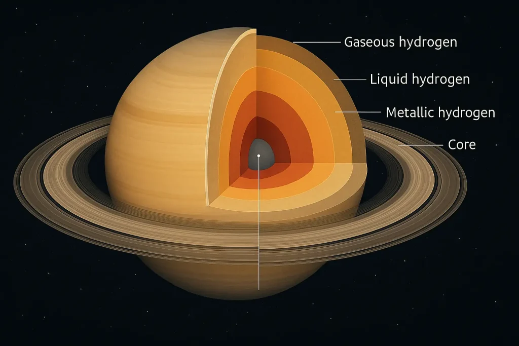 This gas giant, Saturn, boasts a composition primarily of hydrogen (96%) and helium (3%), with traces of methane and ammonia. Saturn’s massive size comes with a low density—only 0.69 g/cm³, less than water’s density, meaning Saturn would float in a large enough ocean. Saturn’s core, likely a mix of rock and ice, spans about 20,000 kilometers (12,400 miles) in diameter, surrounded by a metallic hydrogen layer. Above this lies a thick atmosphere of molecular hydrogen and helium, giving Saturn a layered structure. For example, winds on Saturn can reach speeds of 1,800 km/h (1,118 mph), faster than Earth’s hurricanes. Saturn’s yellowish color results from sunlight scattering off ammonia crystals in the upper atmosphere. Additionally, Saturn experiences extreme temperatures, dropping to -184°C (-300°F) at the cloud tops due to its distance from the Sun. It rotates quickly, completing a day in just 10.7 hours, which flattens Saturn’s shape at the poles. This rapid rotation also generates a strong magnetic field, 578 times more powerful than Earth’s. Therefore, Saturn’s physical traits reveal a dynamic and complex world.