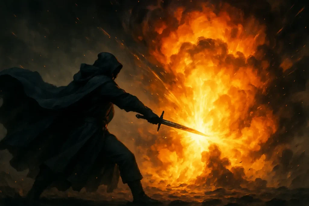 In the fictional world of His Excellency the Shadow, there is a sword named Kagenu that is designed with this same logic. A sword that never strikes, never hits its target, but just by spinning around itself and being on the battlefield, it can destroy everything Disintegrate