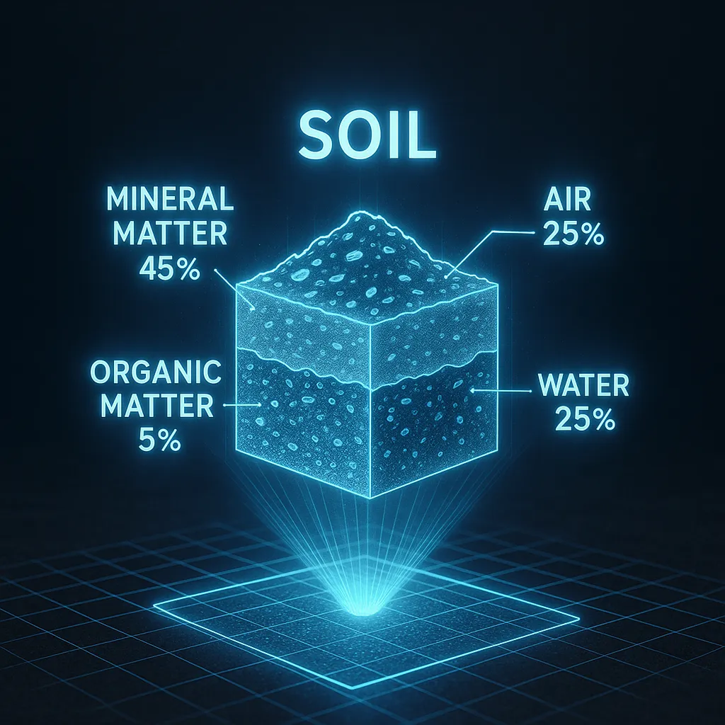 Soil is a blend of mineral content, organic material, water, and air. The mineral content comes from rocks that break down into particles like sand, silt, or clay. Organic material is stuff like dead plants and animals that decompose and add nutrients. On average, soil might be about 45% minerals, 5% organic material, 25% water, and 25% air. Soil composition analysis measures these to see how soil supports plants.